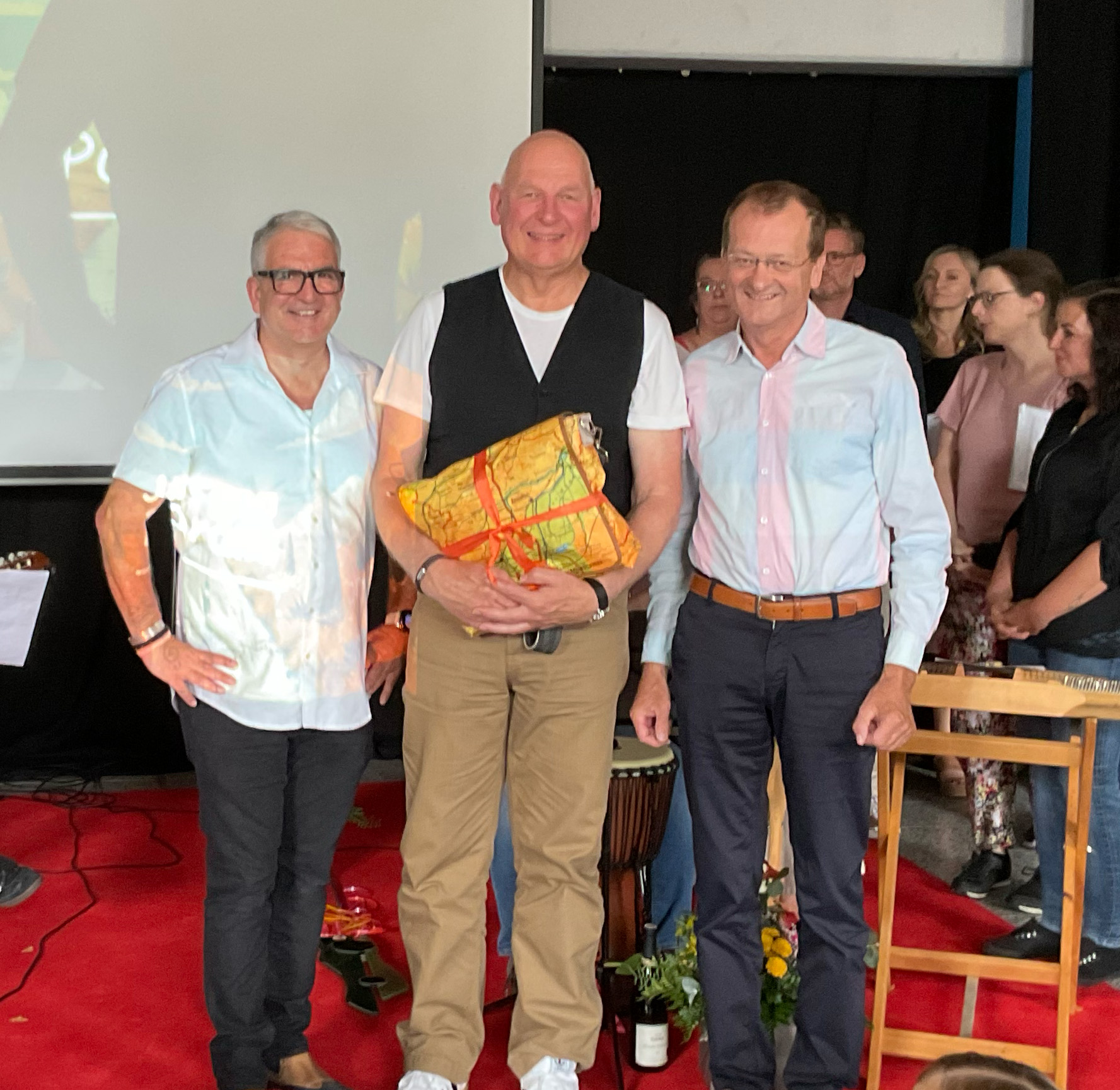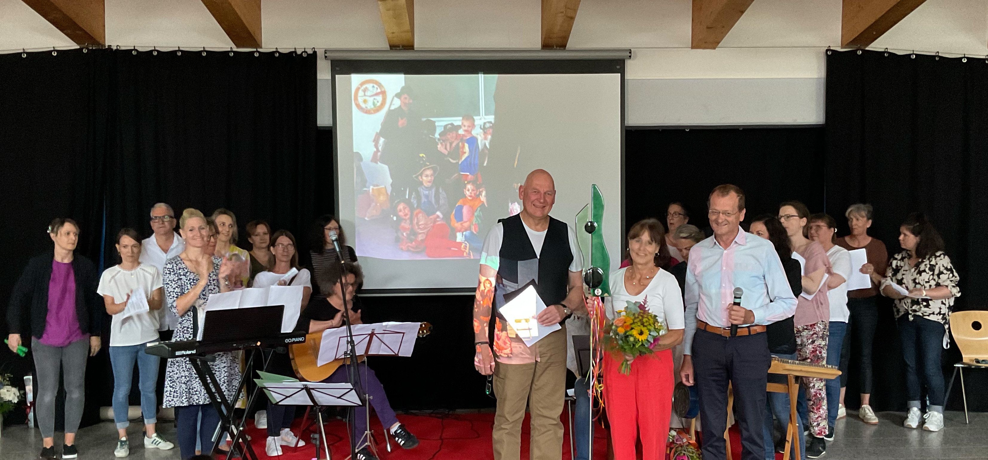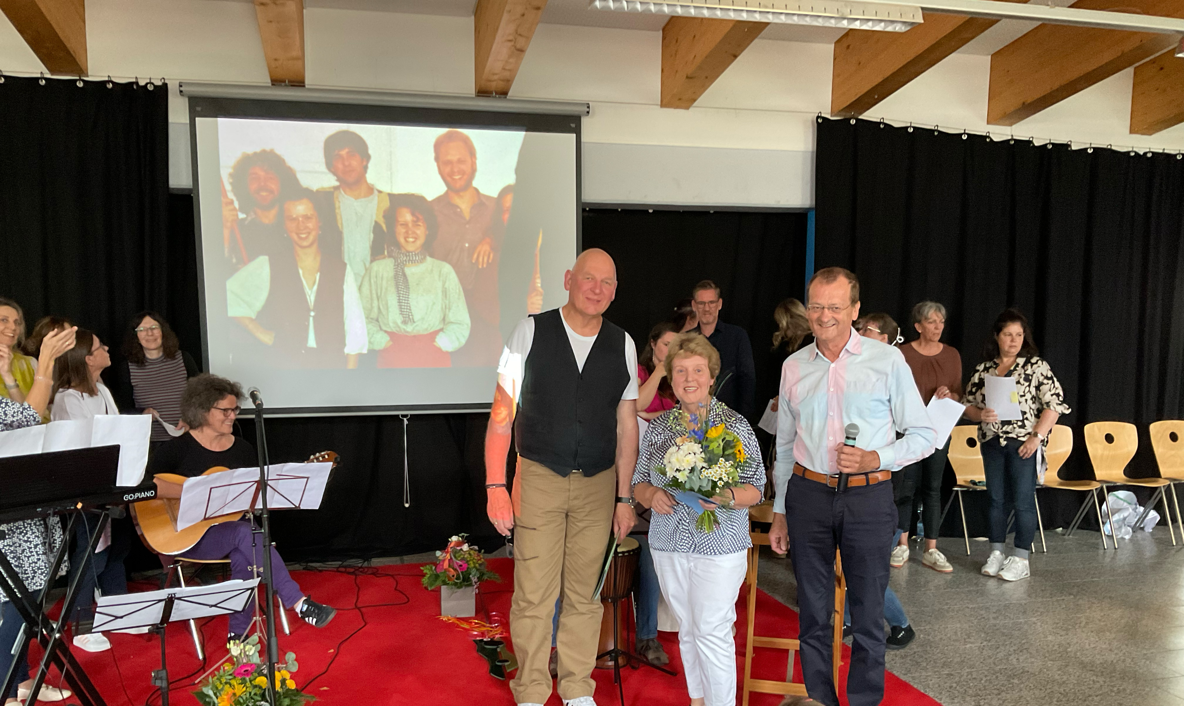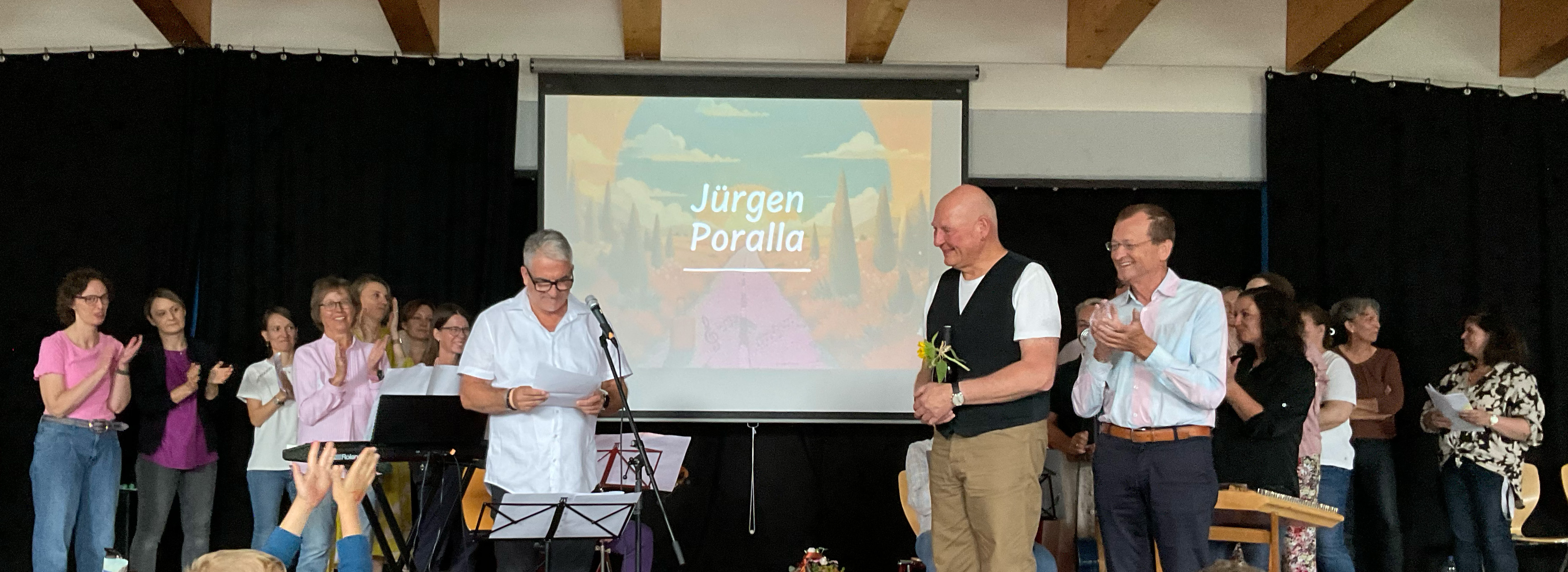 So wurden die zukünftigen Penionsäre Frau Schmid-Rommel, Frau Blitz-Wolf und Herr Poralla musikalisch mit individuellen Texten verabschiedet. Jeder Pensionär bekam seine eigene Strophen, die das Lehrerleben der drei zukünftigen Pensionäre