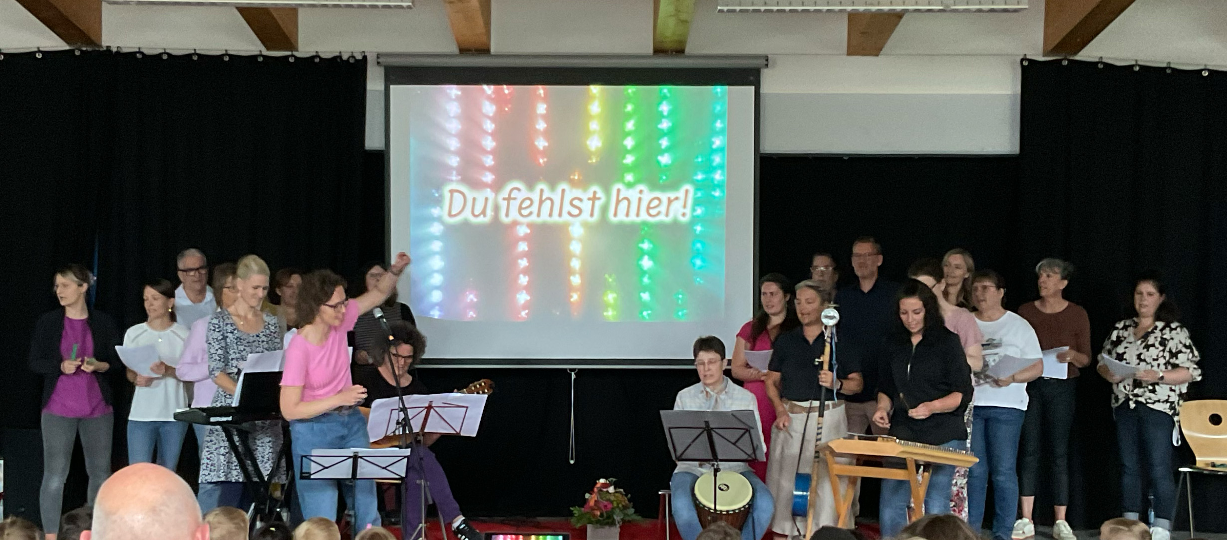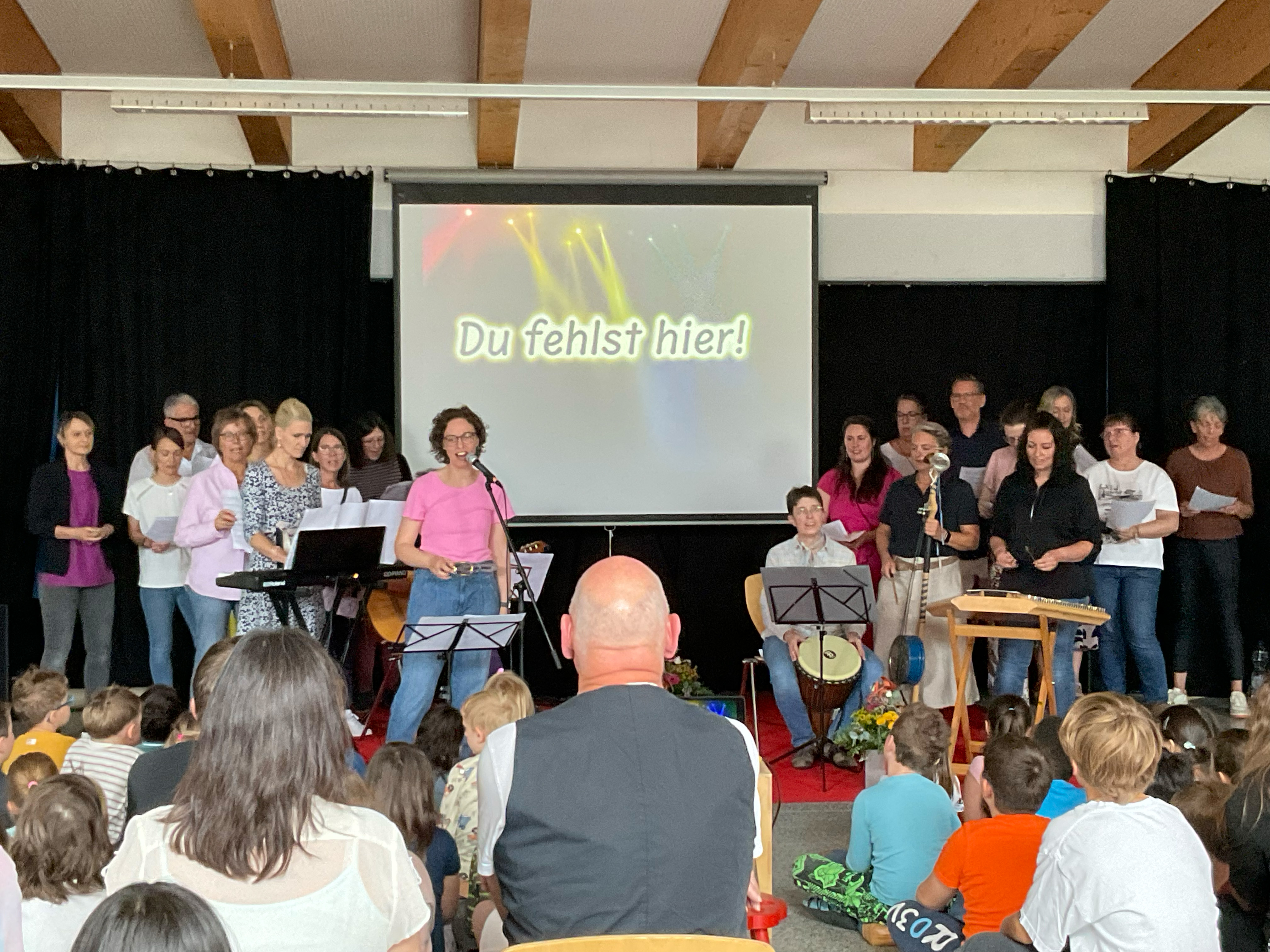 . Die Schülerinnen und Schüler unterstützten die Lehrerband beim Refrain kräftig. Allen war klar: “Ihr fehlt hier!”.