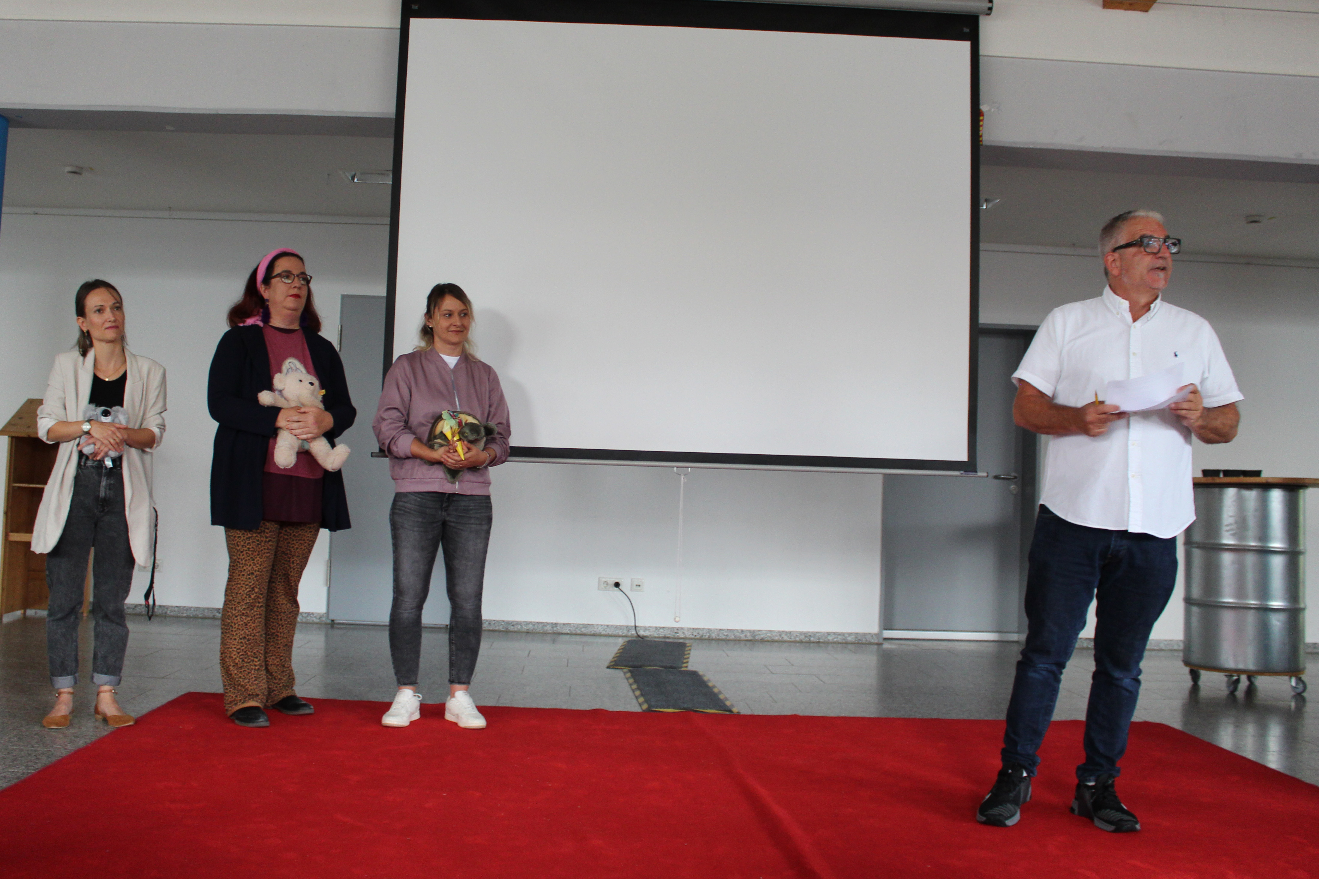 Auch unser Schulleiter Herr Rechenauernahm begrüßte alle Kinder und ihre Familien. Dabei überreichte er jedem Kind eine „Mutmurmel“. Diese kleine Kugel soll unseren Erstklässlern Kraft und vor allem Mut schenken – für all die neuen Aufgaben und auch für die Momente, in denen es einmal schwierig wird oder man nicht mehr weiter weiß. Am Ende unserer Willkommensfeier stellte Herr Rechenauer die Lehrkräfte der neuen ersten Klassen mit ihren Klassenmaskottchen vor: In diesem Schuljahr gibt es eine Bärenklasse bei Frau Dobiasch , eine Koalaklasse bei Frau van Baal und eine Schildkrötenklasse bei Frau Seika. Nachdem jedes Kind einzeln aufgerufen wurde, durften die Kinder mit ihren Lehrerinnen in ihr Klassenzimmer gehen und dort das erste Mal gemeinsam lernen.
