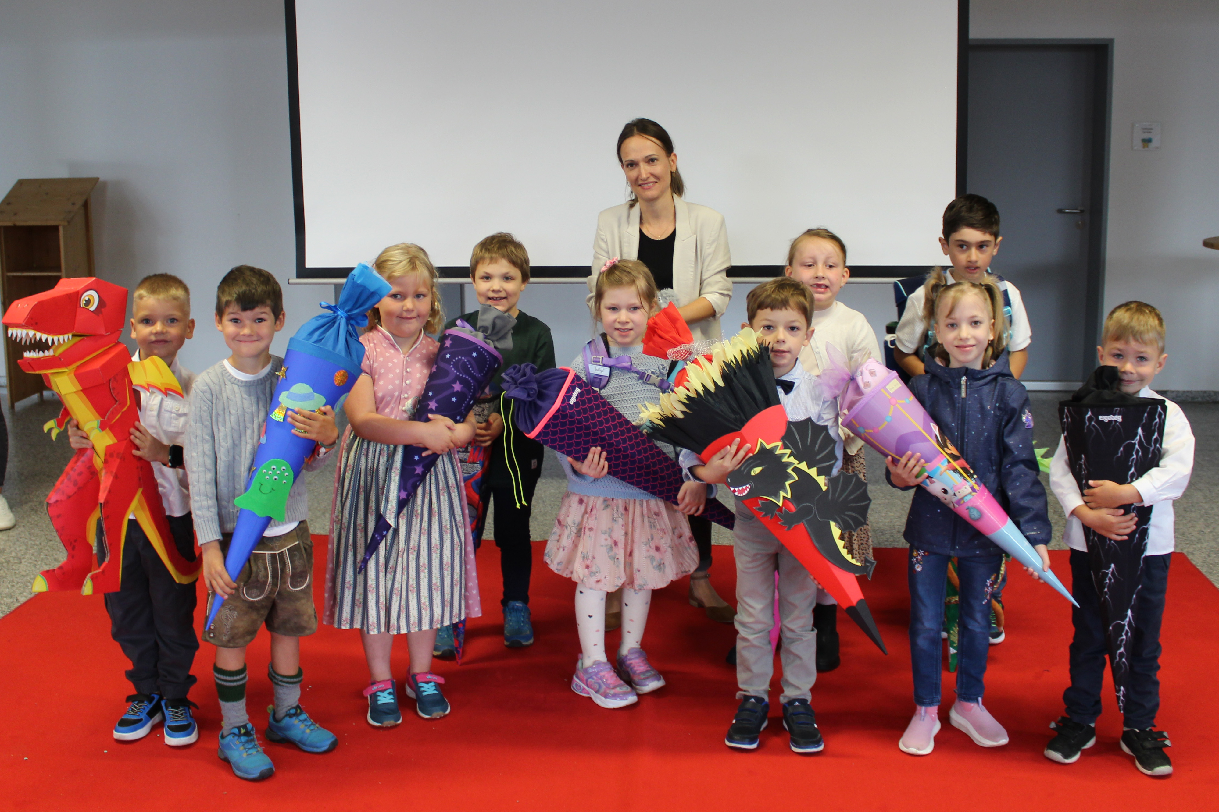 Ein besonderes Highlight war der Auftritt unseres Schulmaskottchens Kitti. Kitti meldete sich aus einem Klassenzimmer und wurde „live“ auf die Leinwand übertragen. Sie begrüßte die Kinder und staunte über die tollen Schultüten der Neulinge.