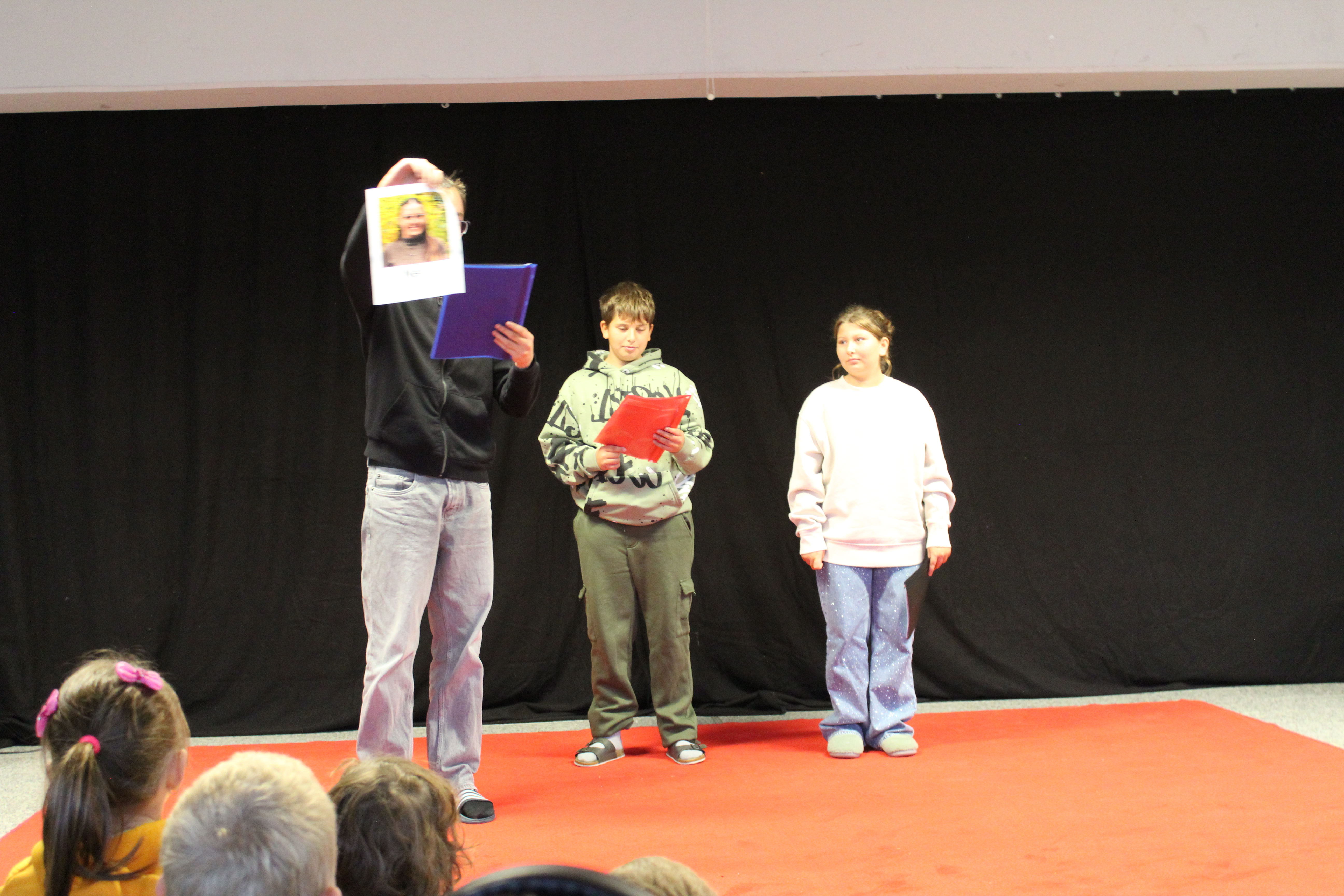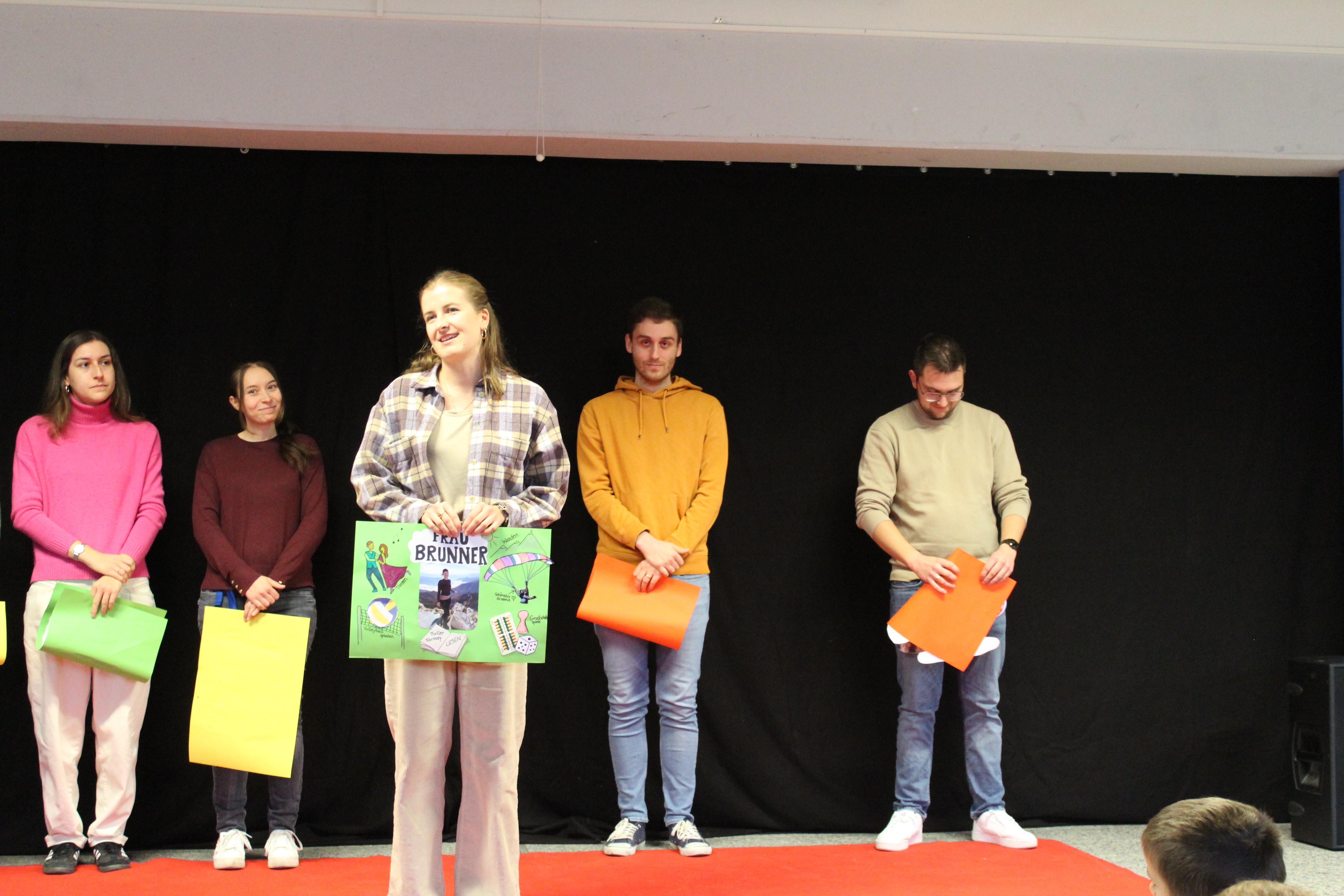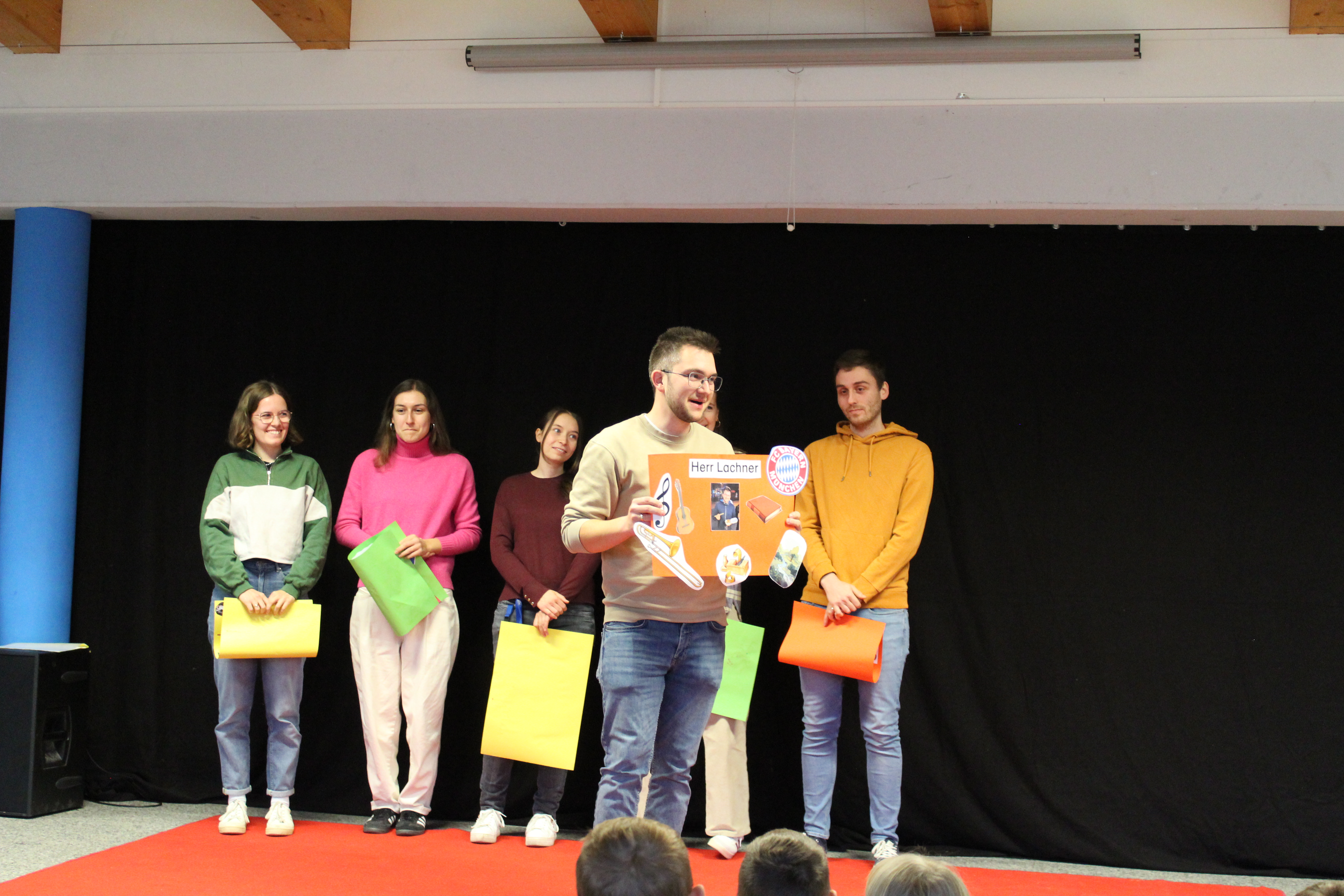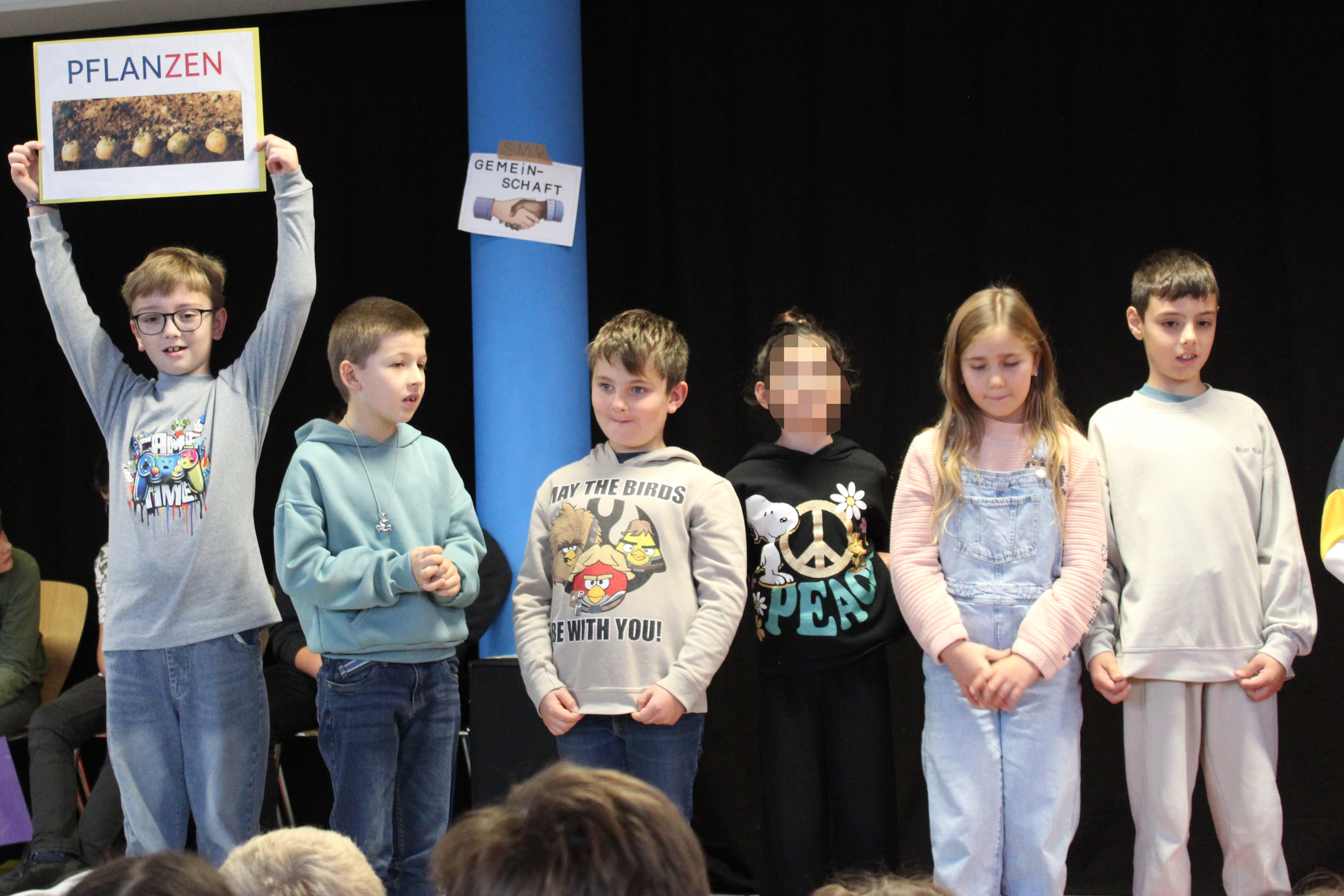 Zuerst stellten sich die sechs neuen Lehrerinnen und Lehrer an unserer Schule vor. Jeder hatte dafür ein tolles Plakat erstellt, das er nun im Schülerforum vor der gesamten Schulfamilie zeigte und erklärte. Als nächstes stellten sich die Vorschul-Gruppen vor. Zusammen mit ihren Gruppenleiterinnen Frau Appel, Frau Baumeister und Frau Kneilling zeigten sie eine kleine Einlage. Auch die drei ersten Klassen wurden auf der Bühne von der ganzen Schulfamilie begrüßt. Anschließend wurde alle neuen Schülerinnen und Schüler, die neu an unsere Schule gekommen sind, mit einem Applaus herzlich begrüßt. Zum Schluss wurden noch alle Schulbegleiterinnen und Schulbegleiter unserer Schule willkommen geheißen.