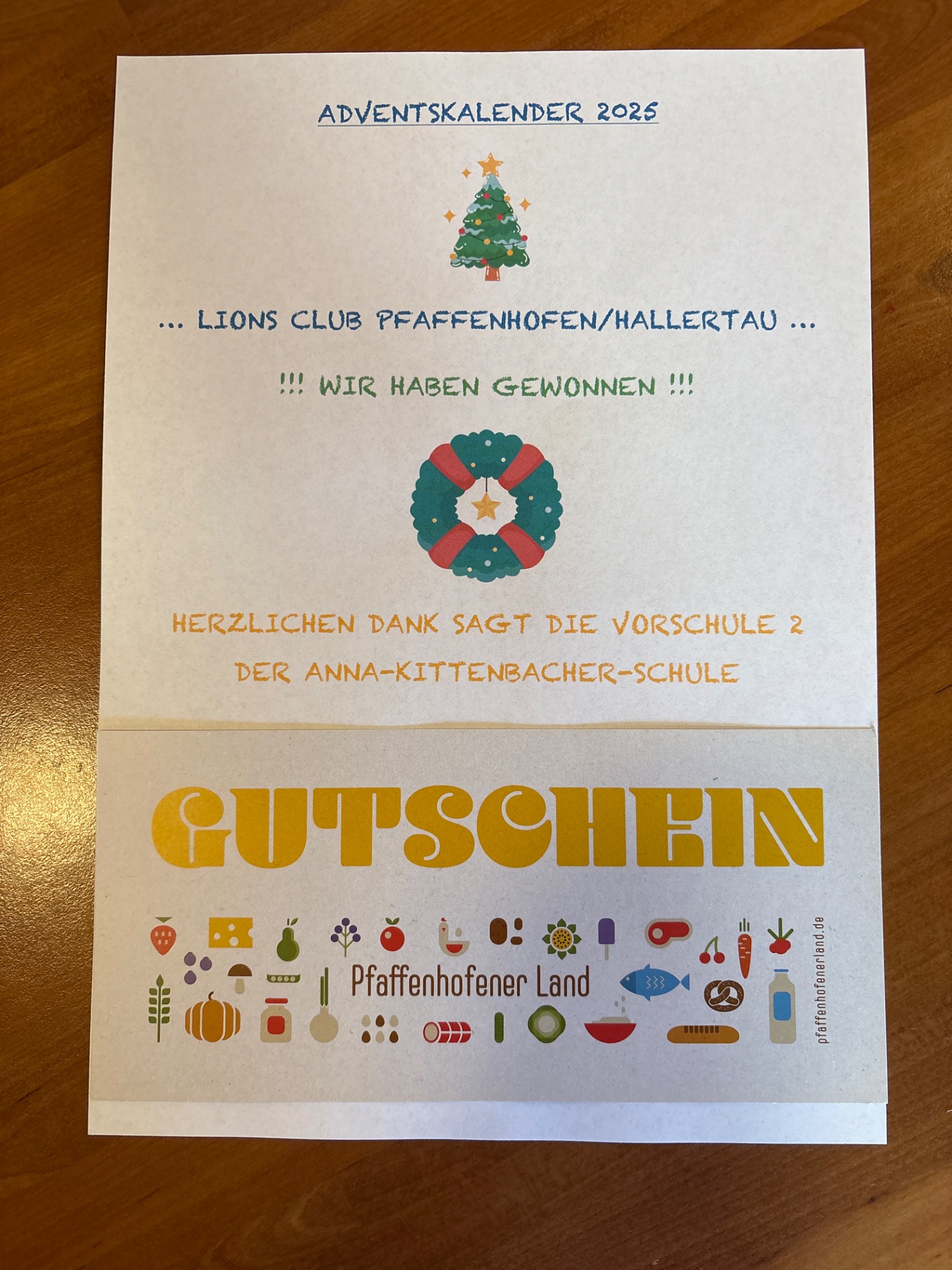 In der Vorweihnachtszeit gab es an unserer Schule wieder eine besonders schöne Überraschung: Jede Klasse und jede Gruppe hat einen der begehrten Adventskalender des Lions Clubs Pfaffenhofen erhalten. Jeden Tag warteten die Kinder gespannt, ob ihre Kalendernummer wohl gewinnt. Für die Kinder der Vorschule 2 war die Freude nun riesig! Sie haben einen 10 Euro-Gutschein vom „Pfaffenhofener Land“ gewonnen. Der Gutschein wird in ein gemeinsames, gesundes Frühstück investiert!